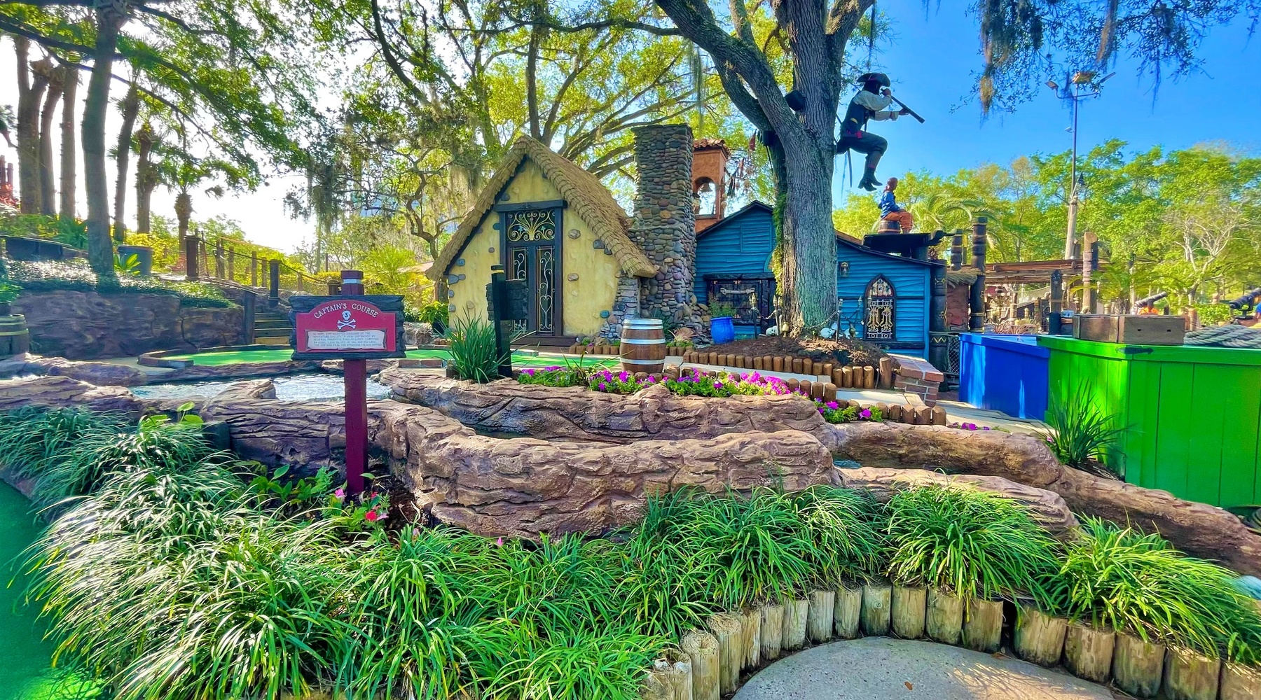Pirate’s Island and Pirates Cove offer a unique “Adventure Golf” experience for ages 3 to 93. Follow in the footsteps of notorious pirates like Blackbeard and Captain Kidd. Begin your themed adventure at our seaside village and depart along the shores of the tidal lagoon. Continue through the caves where pirates buried their booty and explore the mountain to view a panorama of our entire pirate adventure. Extraordinary landscapes, waterfalls, streams and bridges await, as you stroll through this themed setting.