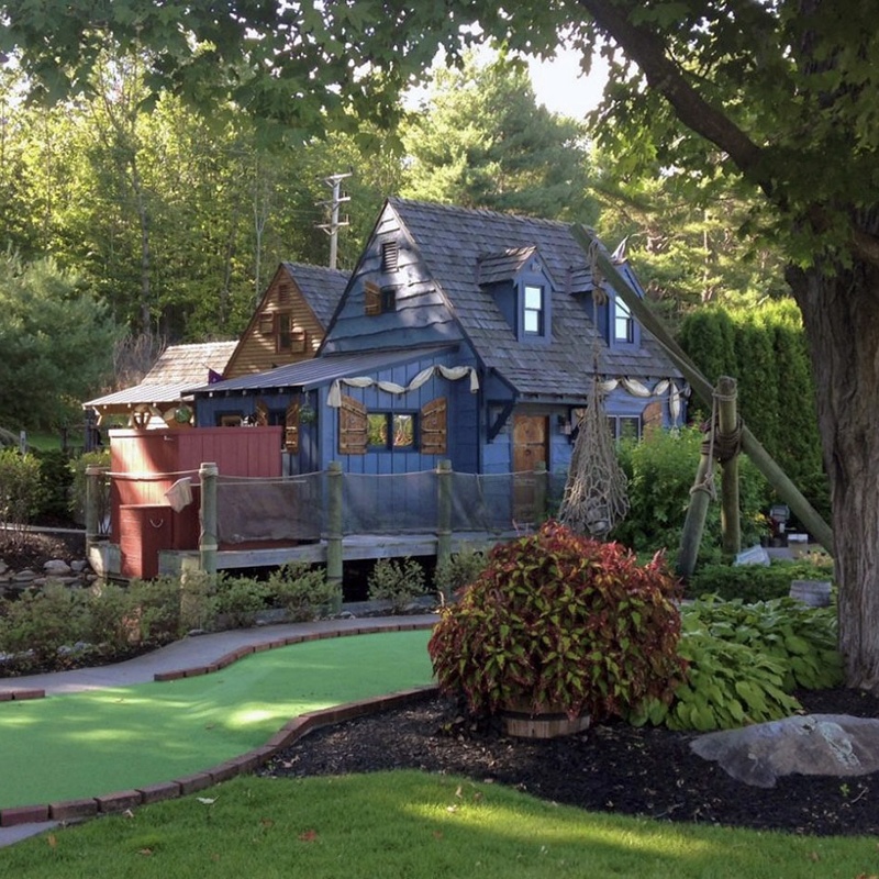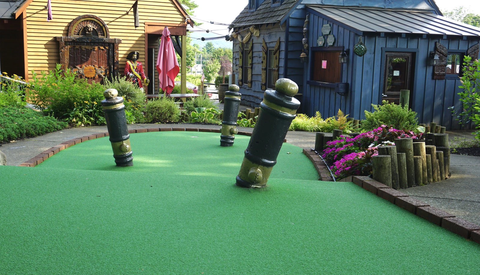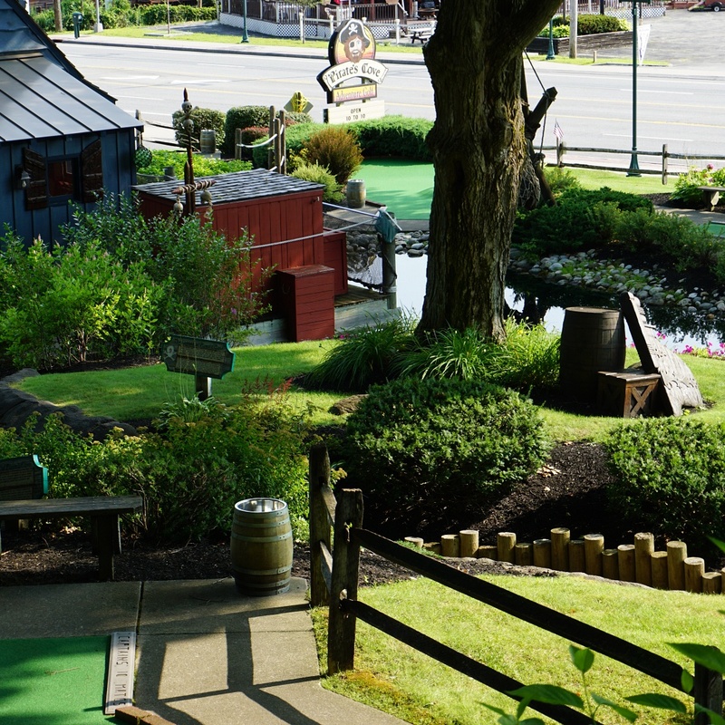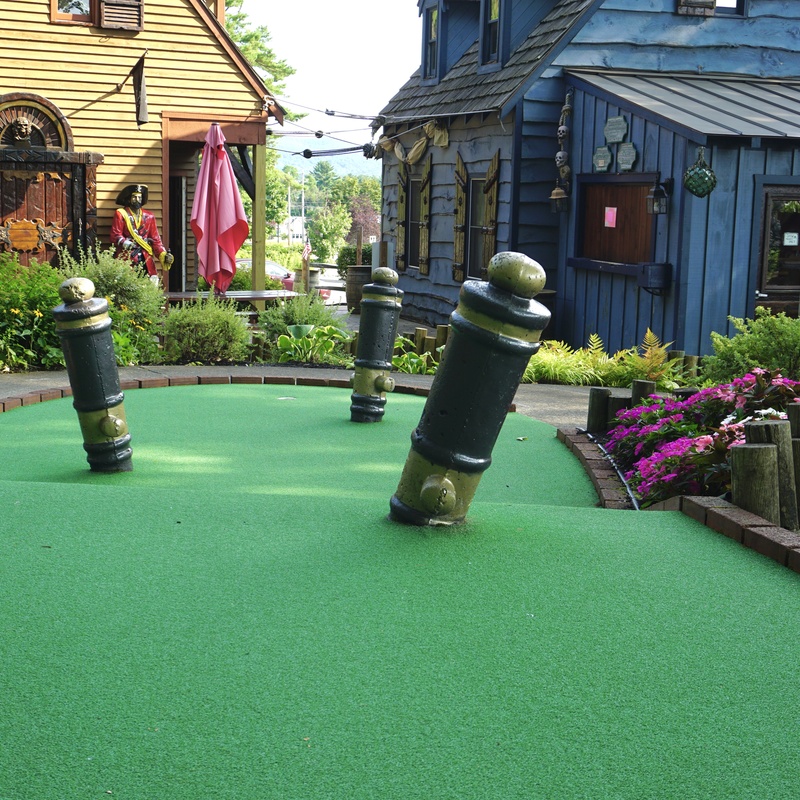 Our beautifully manicured 18-hole course is the perfect family attraction in the heart of the Adirondacks. Along with our sister course in Queensbury, we are the only authentic pirate-themed mini golf experiences in the region, providing unforgettable adventures for locals and travelers alike. Step into a sleepy 18th-century village under pirate occupation as you navigate sunken ships, cascading waterfalls, treacherous dungeons, and lush tropical landscaping. Discover the tales of legendary buccaneers while putting your way through imaginative holes that are designed to delight both kids and adults. Keep an eye out for mischievous pirates lurking overhead, and see if you can claim the treasure by sinking that lucky hole-in-one!
